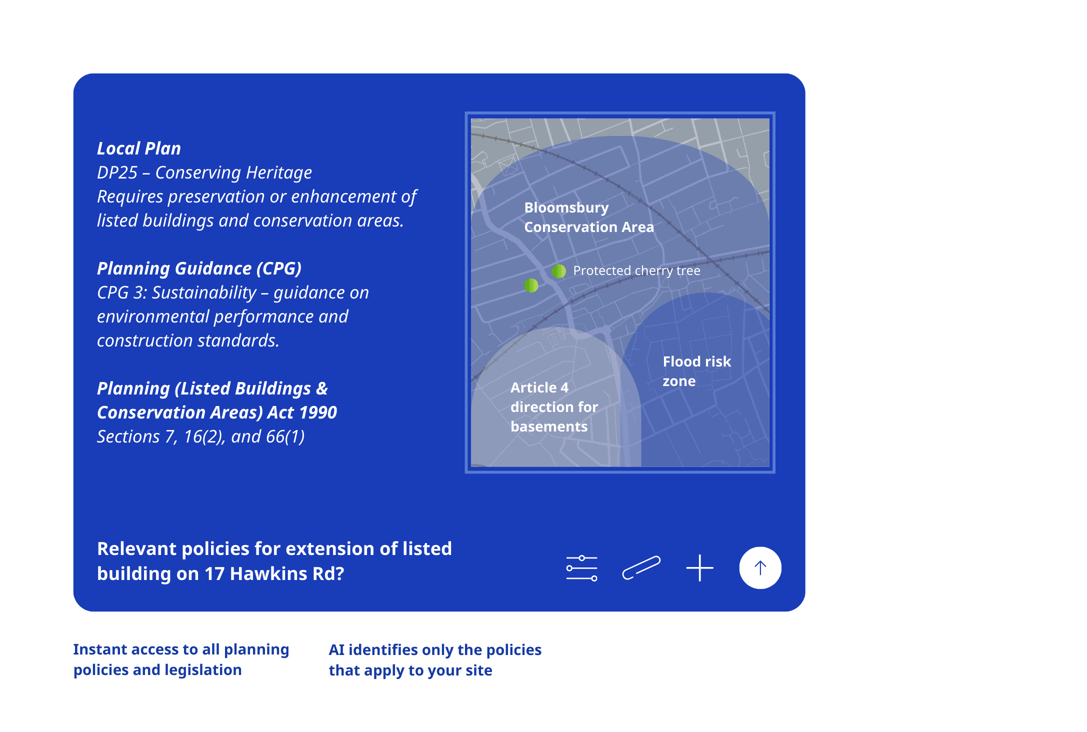 Get all relevant planning policies automatically. Our tool analyses national planning policy, Local Plans, Neighbourhood Plans, conservation areas, flood maps, and listed building constraints to ensure your proposal is fully policy-compliant.